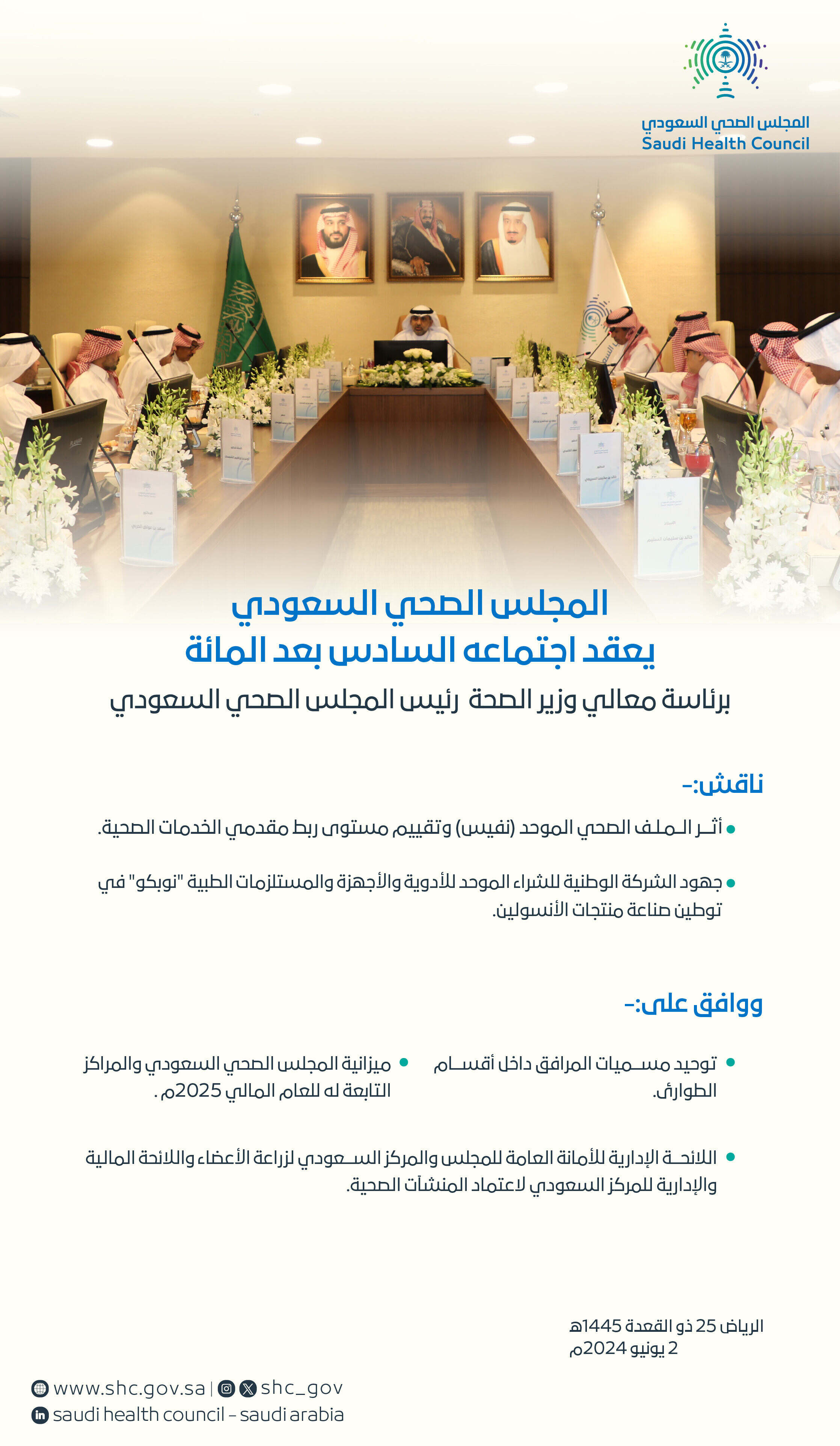 واطلّع المجلس خلال اجتماعه على جهود الشركة الوطنية للشراء الموحد للأدوية والأجهزة والمستلزمات الطبية "نوبكو" في توطين صناعة منتجات الأنسولين.