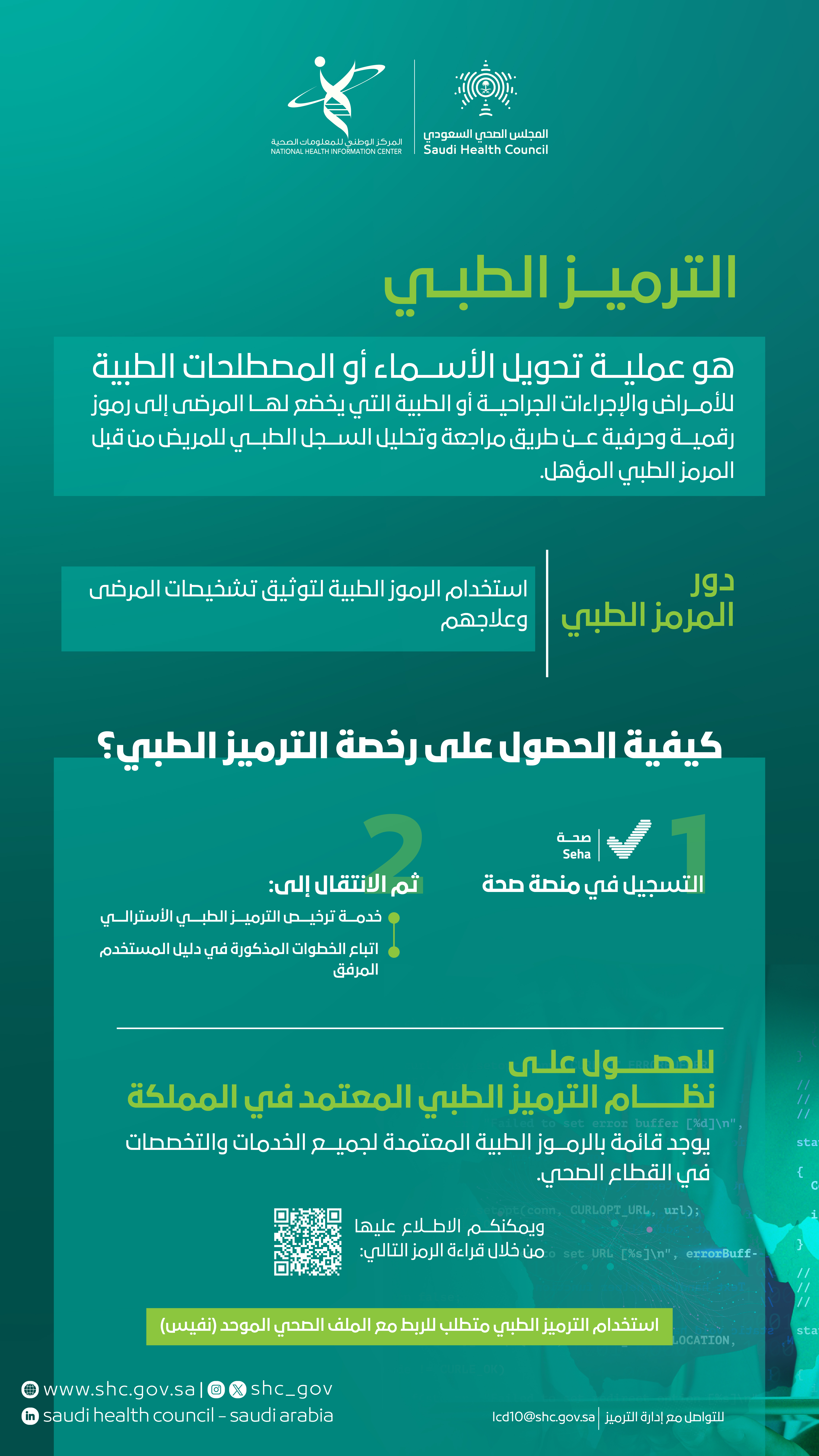 ضمن المشاريع والبرامج التي يقوم بها المجلس الصحي السعودي لتحسين جودة الرعاية الصحية ورفع كفاءتها وتسهيل الحصول عليها من خلال رقمنة القطاع الصحي؛ الترميز الطبي الذي يعمل على تحويل الأسماء أو المصطلحات الطبية للأمراض والإجراءات الجراحية أو الطبية التي يخضع لها المرضى إلى رموز رقمية وحرفية عن طريق مراجعة وتحليل السجل الطبي للمريض من قبل المرمز الطبي المؤهل الذي يستخدم الرموز الطبية لتوثيق تشخيصات المرضى وعلاجهم.