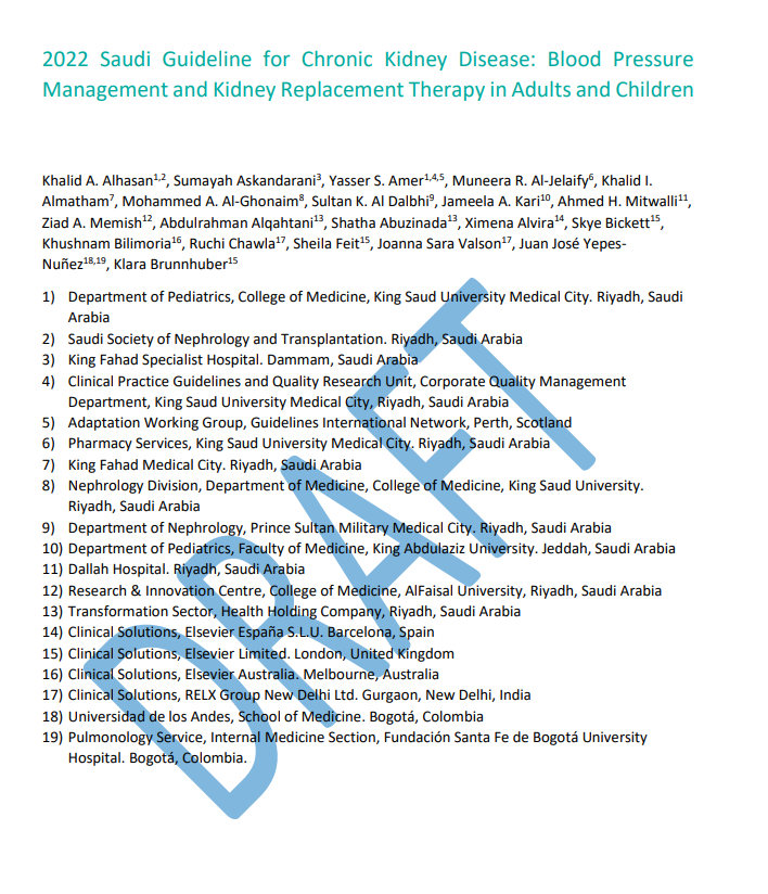 " الدليل السريري السعودي ٢۰٢٢ لأمراض الكلى المزمنة: علاج ارتفاع ضغط الدم وزراعة الكلى للبالغين والأطفال" والذي تم إعداده من قبل خبراء محليين وعالميين. وكجزء من آلية اعتماده كدليل وطني، نطرح للعموم هذه المسودة لإبداء الملاحظات والمقترحات.