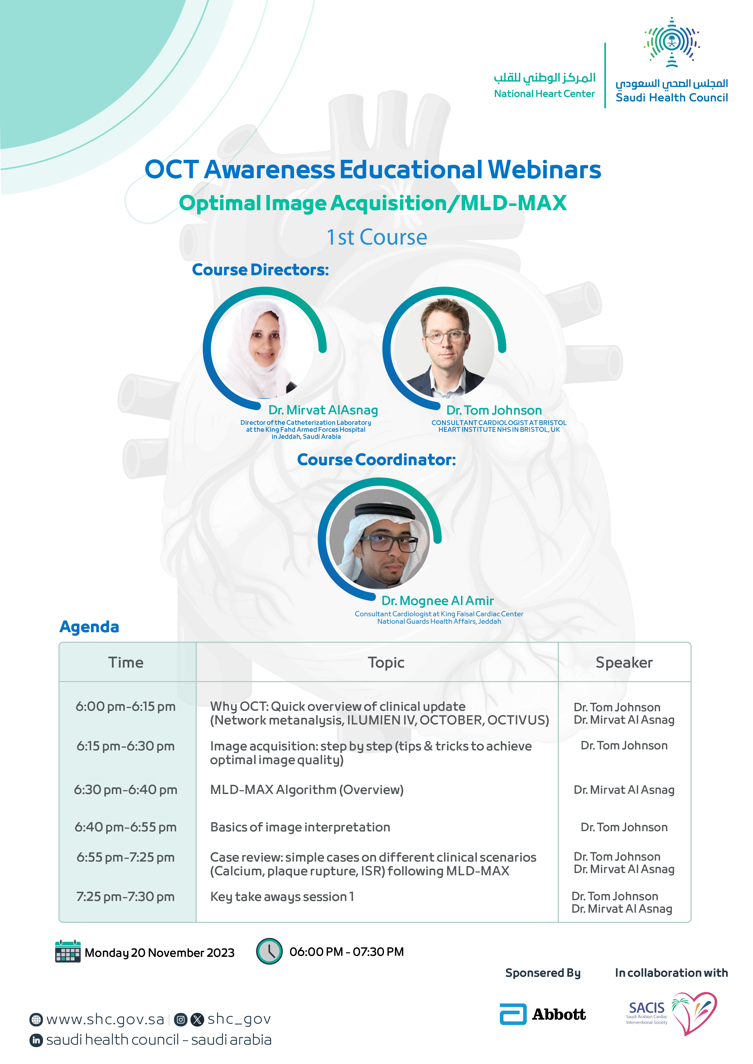 Page Image Page ContentOCT Awareness Educational WebinarOptimal Image Acquisition \ MLD - MAX💻Live Webinar🗓 Monday November 20, 2023🕗Time: 06 :00 – 07:30 pm For registration:https://www.octsaudiwebinars.com/