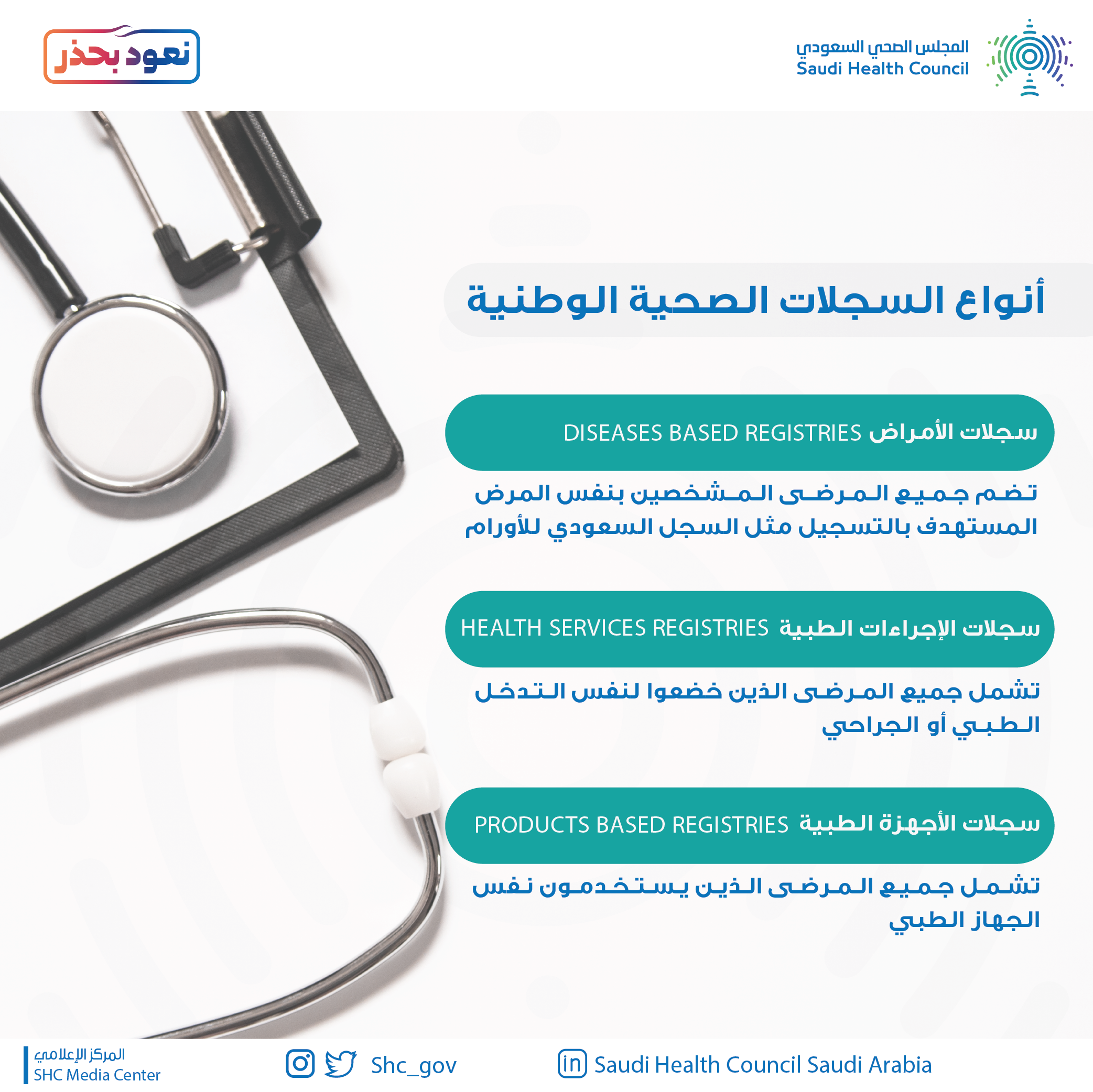 يشارك في السجلات الصحية الجهات الصحية كافة بالقطاعين الحكومي والخاص، التي تعالج الأمراض محل نطاق السجل، وكذلك يشارك في السجلات الهيئة السعودية للتخصصات الصحية، مجلس الضمان الصحي التعاوني، هيئة الهلال الأحمر السعودي، والمركز السعودي لسلامة المرضى، وبرنامج شراء الخدمات الصحية، بالإضافة إلى الجهات الأخرى ذات العلاقة بالشأن الصحي، وغيرها من الجهات ذات الاهتمام المشترك بأعمال السجل.