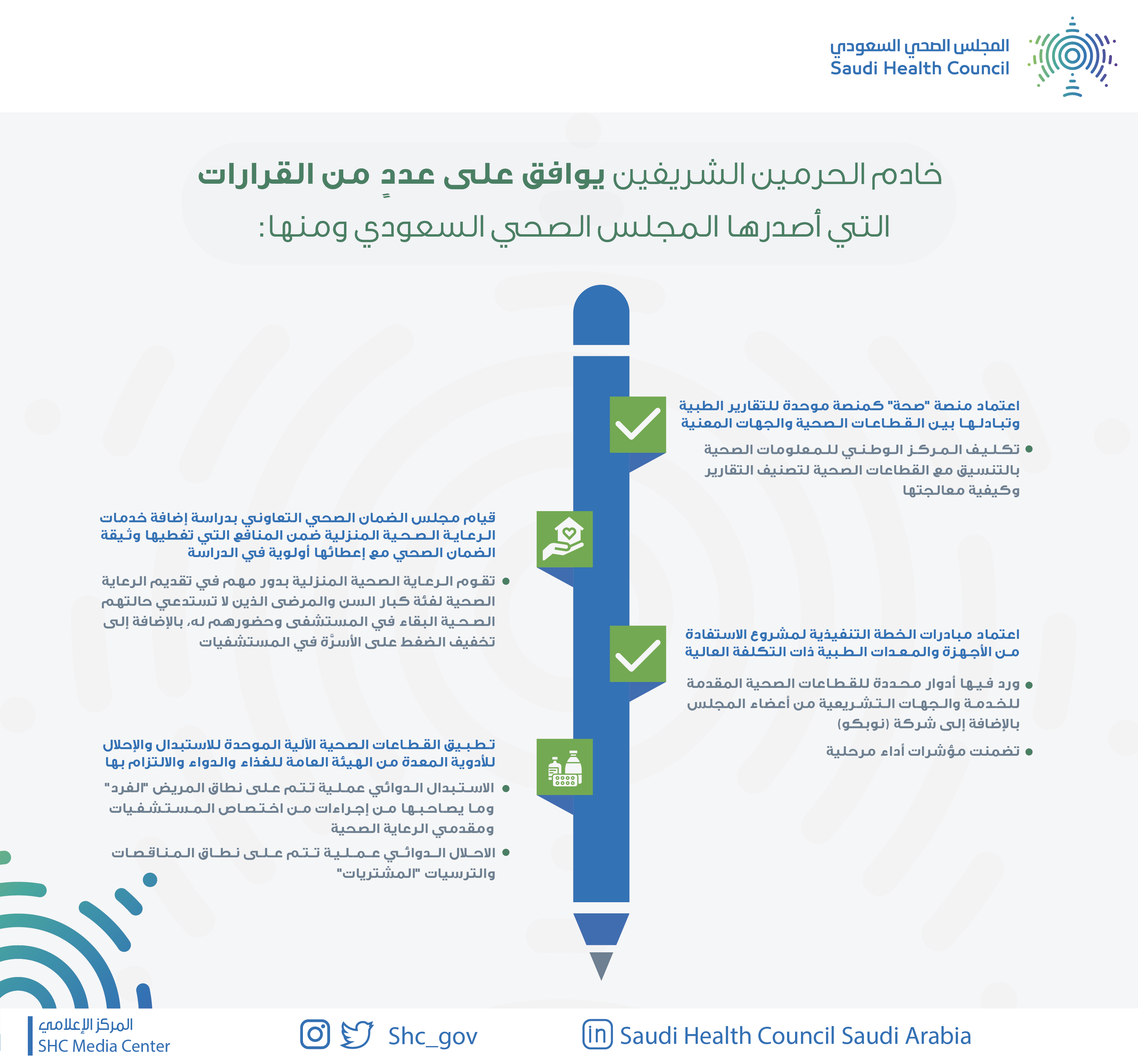 صدرت موافقة خادم الحرمين الشريفين الملك سلمان بن عبدالعزيز آل سعود، رئيس مجلس الوزراء، - حفظه الله - على عددًا من القرارات التي اتخذها المجلس الصحي السعودي منها؛ اعتماد منصة "صحة" كمنصة موحدة للتقارير الطبية وتبادلها بين القطاعات الصحية والجهات المعنية، وتكليف المركز الوطني للمعلومات الصحية بالتنسيق مع القطاعات الصحية لتصنيف التقارير وكيفية معالجتها.