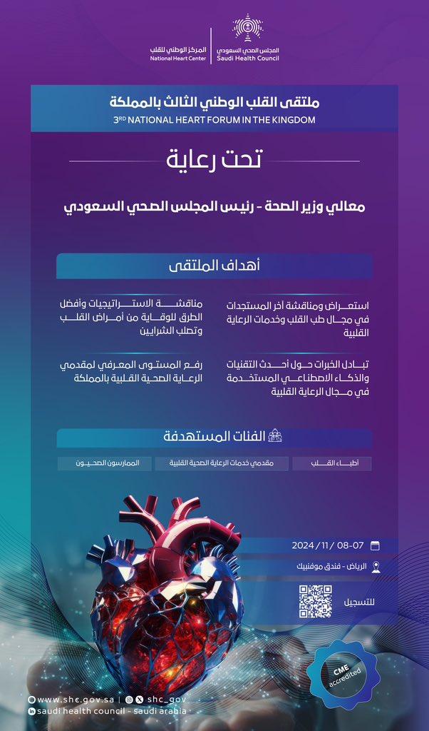 تحت رعاية معالي وزير الصحة رئيس المجلس الصحي السعودي، ينظم المجلس ملتقى القلب الوطني الثالث في مدينة الرياض خلال الفترة من 7- 8 نوفمبر 2024م؛ لمناقشة مستجدات أمراض وجراحة القلب، بحضور ومشاركة نخبة من المختصين محليًا وعالميًا.